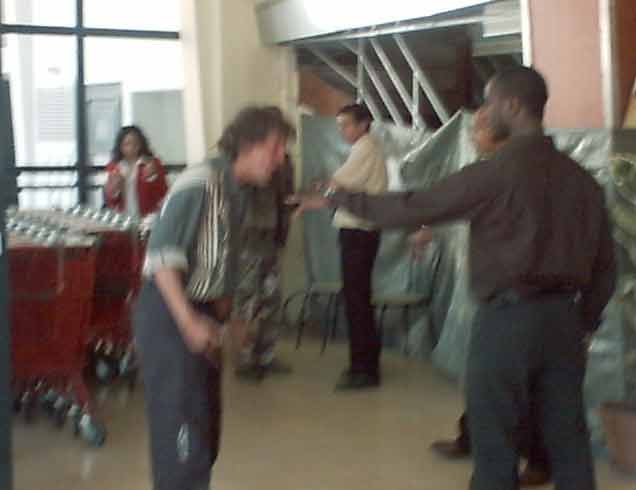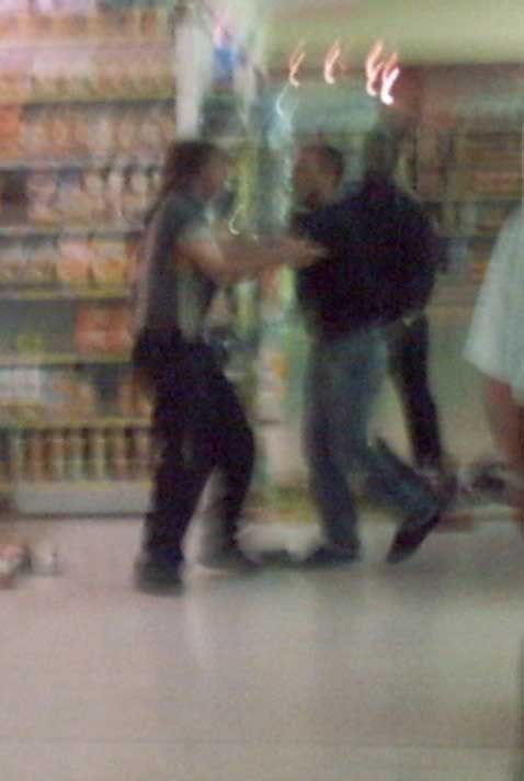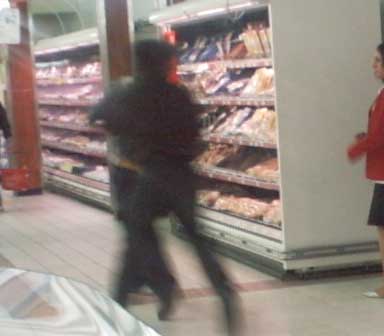 Je fesais mes courses au super marché avec un ami, j'avais mon appareil photo, je voulais prendre des photos des rues et monuments de la ville pour les mettre sur internet, quand j'assiste héberlué à cette scène de violence entre les vigiles et 2 clients "marginaux": coup de point, le premier le plus petit habillé en trailli de l'armée est allongé par terre, bousculade, les vigiles ne font pas leur boulot à moitié, ils sortent les gars à plusieurs en les trainant par terre. Devant le déluge de baffes ceux ci n'opposaient evidemment aucune résistance et voulaient bien sortir et poutant ca continuait de taper, c'est pour ca que je trouve que c'est de la violence gratuite.