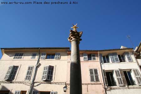 J'ai oublié le nom de cette place mais c'est adjacent au palais de justice au tout cas, face a l'eglise de la Madelaine ... Une fontaine prés du palais de Justice d'aix en provence, la place des precheurs peut etre, l'etoile dorée en haut de la colonne reflete dans le bleu du ciel, Aix est magnifique n'es ce pas !