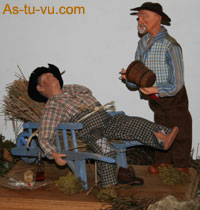 Santon endormi dans une brouette avec de la paille. Son ami à cote de lui a l'air de vouloir lui servir à boire mais le personne semble repus, il a un ventre énorme. A ses pieds un saucisson et les restes d'un gros casse croute. Le gros il fait sa sieste, il a trop mangé!