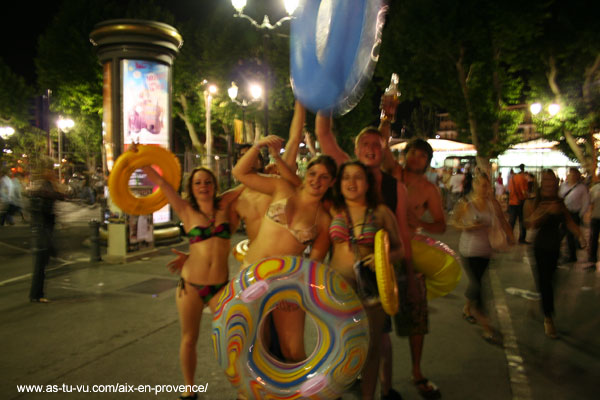 Photo de fêtards et fêtardes en maillots de bain et avec des boués prises à la rotonde pres de la station de taxis, j'ai vu cette equipe de joyeux lurons un peu partout dans les rues du centre ville, pas vous?
