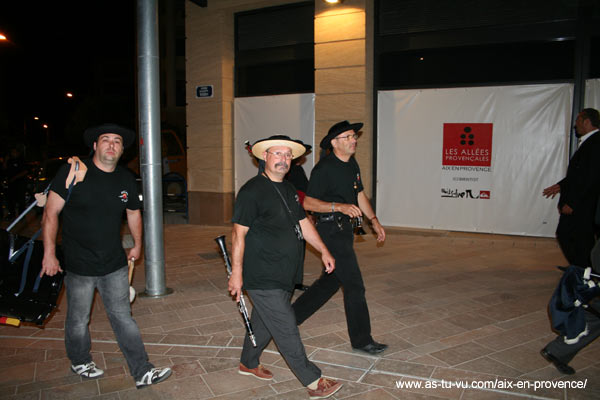 Photos des allees provencales, joeurs de flutes habillés en habits de folklore provencal et remontant les allées
