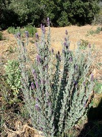 Lavandula stœchas, ou lavande stéchas, lavande papillon (nom surtout donné à la sous-espèce L. stœchas pedunculata). À l'état sauvage, c'est certainement la lavande dont le territoire géographique est le plus vaste (tout le pourtour méditerranéen). Mais elle n'est d'aucune utilité en parfumerie : elle sent un peu le camphre, et rien d'autre. Elle se distingue des espèces précédentes par deux caractéristiques : d'une part elle apprécie surtout les terrains siliceux, notamment le schiste; de l'autre elle possède à l'extrémité de ses épis de grandes bractées violettes, souvent plus foncées que les fleurs proprement dites. Floraison : avril-juillet.